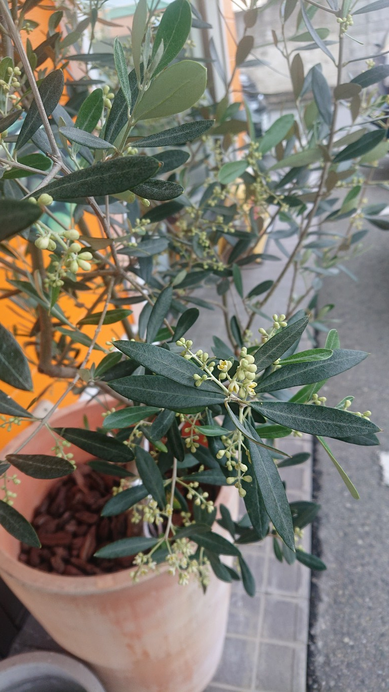 きこうの事務所前に置いているオリーブに花が咲いているんです!